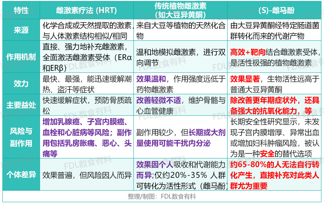 为了更清晰地展示S-雌马酚的独特优势,我们将其与雌激素疗法(HRT)和传统植物雌激素(如大豆异黄酮)进行对比: