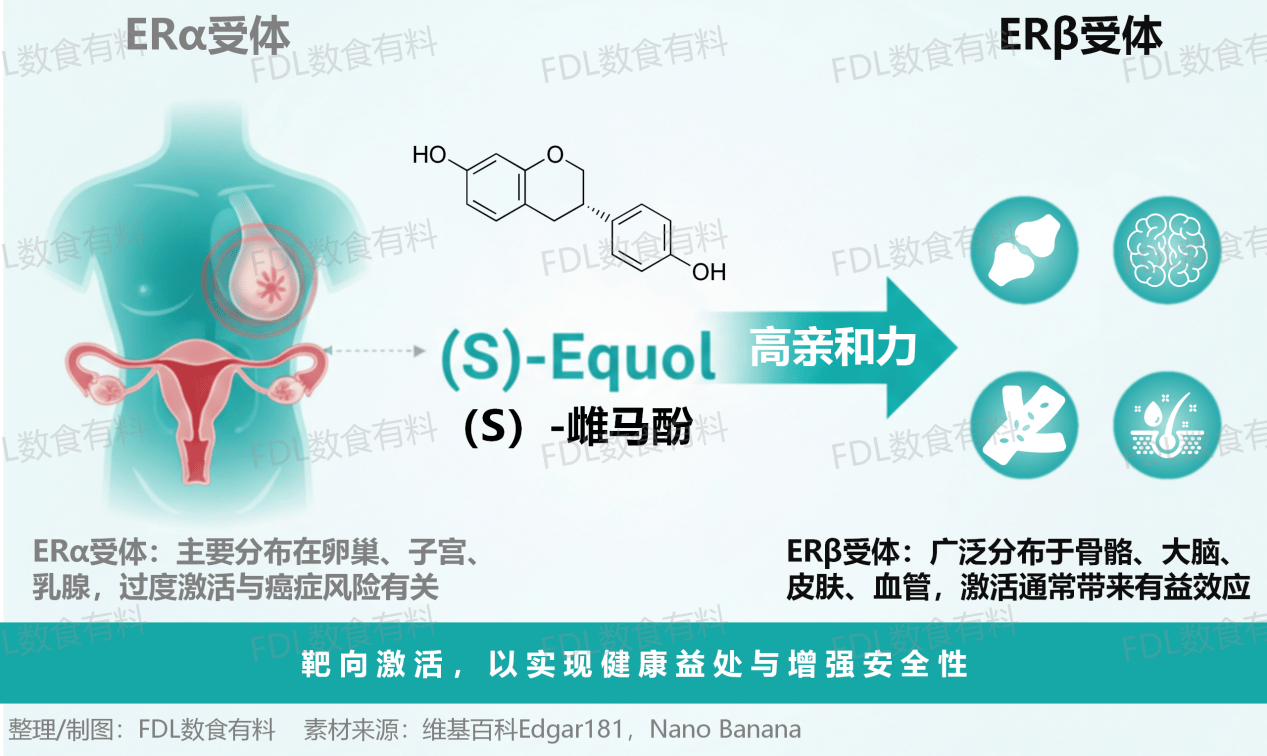 S-雌马酚的精妙之处在于,它对ERβ受体的亲和力远高于ERα受体(约为13倍)。这种“偏爱”使其能够精准靶向并激活ERβ,从而在多个方面发挥积极作用;同时,由于其对ERα的结合力较弱,避免了对子宫和乳腺组织的过度刺激,这是其区别于传统激素疗法、保障安全性的关键。