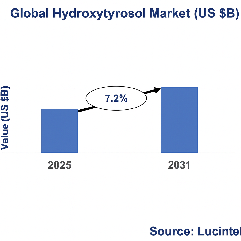 目前,该市场已步入快速成长期,预计在2025年至2031年间,复合年增长率将达到7.2%。这一增长主要得益于科学验证的不断推进,以及消费者对天然成分偏好的日益增强。与此同时,行业也逐渐从依赖橄榄副产物提取,转向高纯度工业化制备(如酶法、化学与生物合成)及原料标准化,从而有效推动上游规模化生产与终端产品的多样化发展。