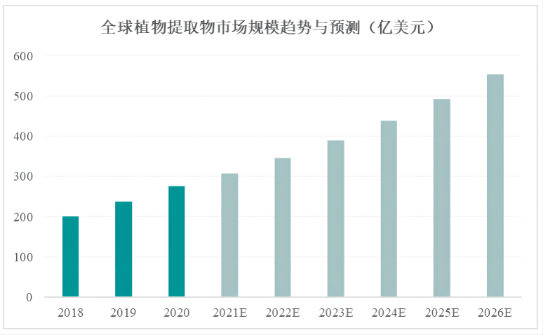 从行业来看,天然植物提取成分有着巨大的发展潜力和空间。根据Markets and Markets数据显示,预计2021年全球植物提取物成分市场为308亿美元,并将于2026 年达到553亿美元,复合增长率为12.42%。